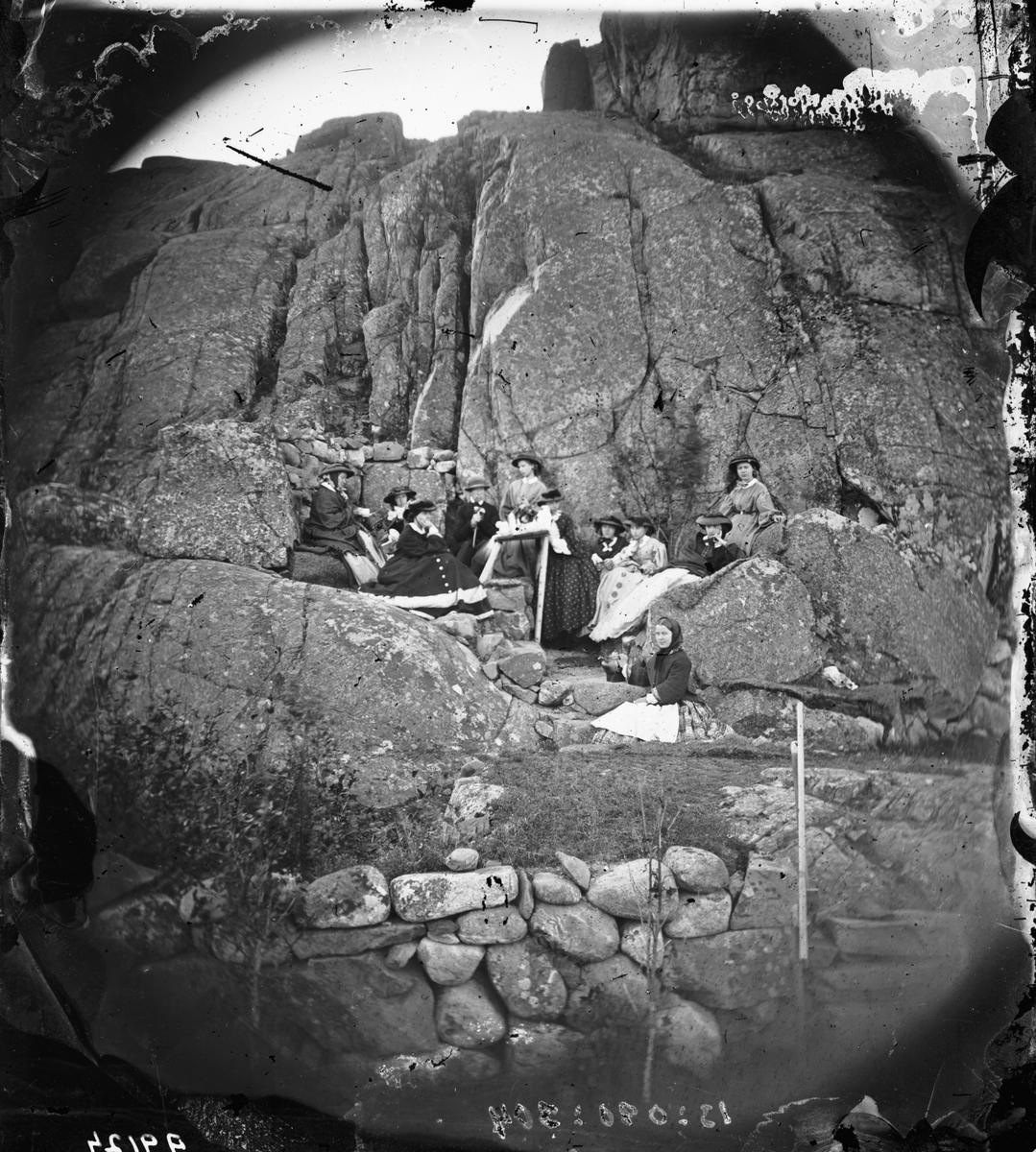 Kvinnor sittande i en bergsskreva, möjligen i Lysekil.