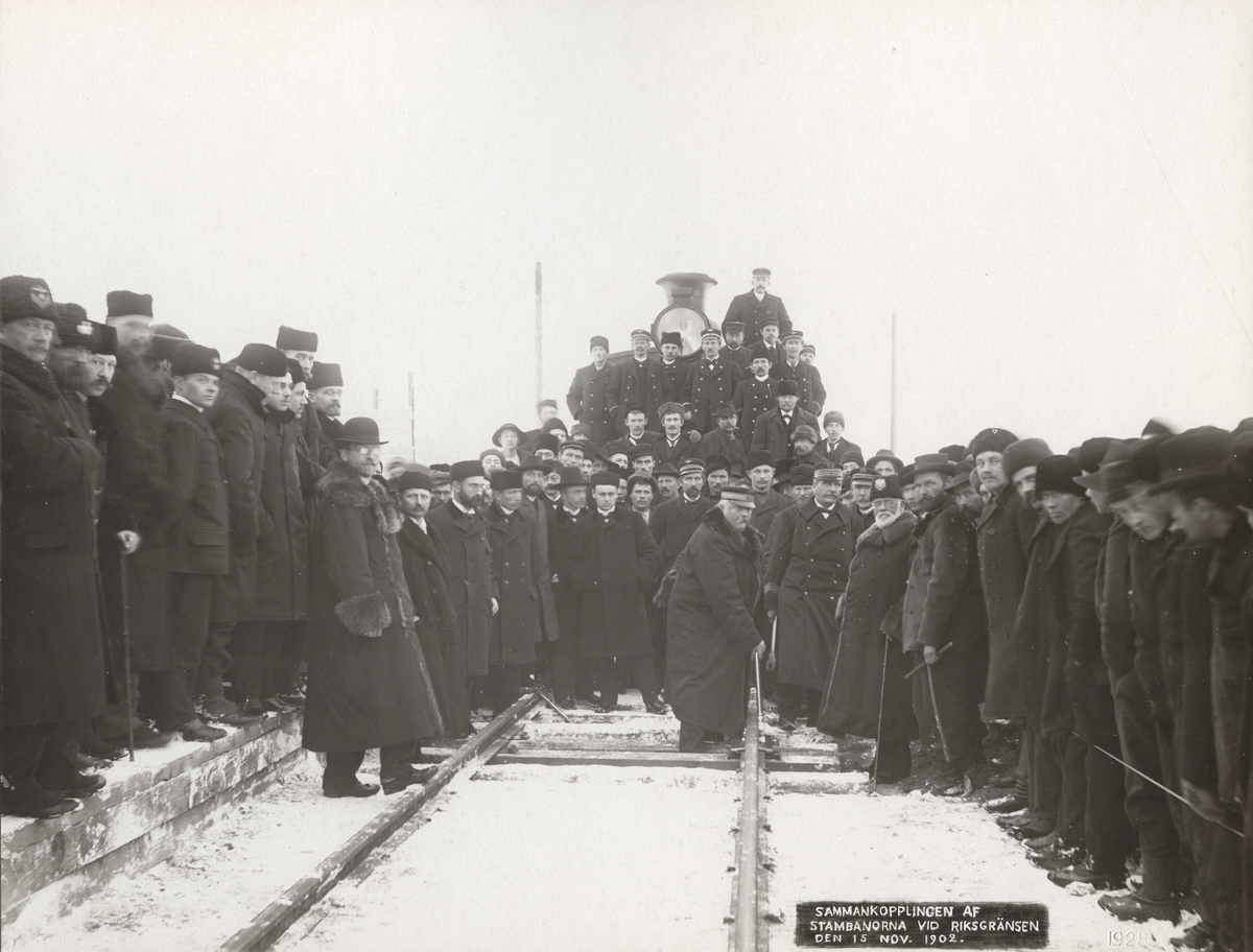 Från Rikgränsbanans bygge: general Nordström sammankopplar svenska Riksgränsbanan med den norska vid Riksgränsens station den 15 november 1902. Mitt emot honom står överingenjör Lundberg och mellan dem den norske generaldirektören.