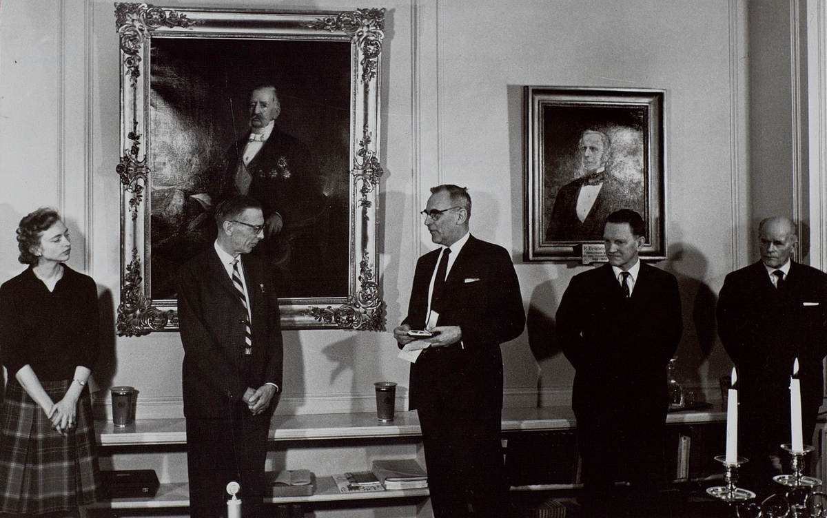 Utdelning av Akrell-medaljen till Hans Heimburger 1962. Från vänster fr. G. Helgesson, hans Heimbürger, gd H. dterky, bd S. Hultare och bd Tor Pehrson.