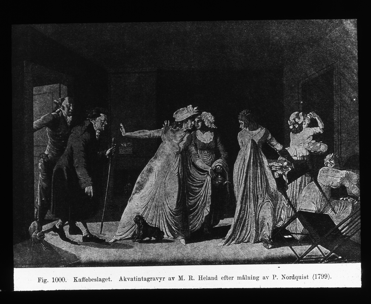 Kaffebeslaget. Akvatintagravyr av M. R. Heland efter målning av P. Nordquist (1799).