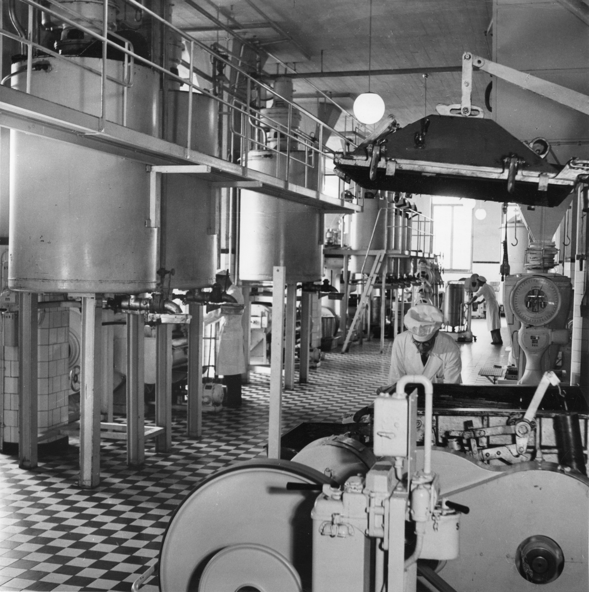 Arbete i den så kallade Chokladhallen hos Cloetta i Ljungsbro. Den råa kakaomassan förvaras och silas till vänster. Den tillsättes med socker, mjölk etc. allt efter den chokladsort, som skall tillverkas. Härefter får den genomgå en omsorgsfull bearbetning i olika maskiner för att så småningom bli läcker ätchoklad.