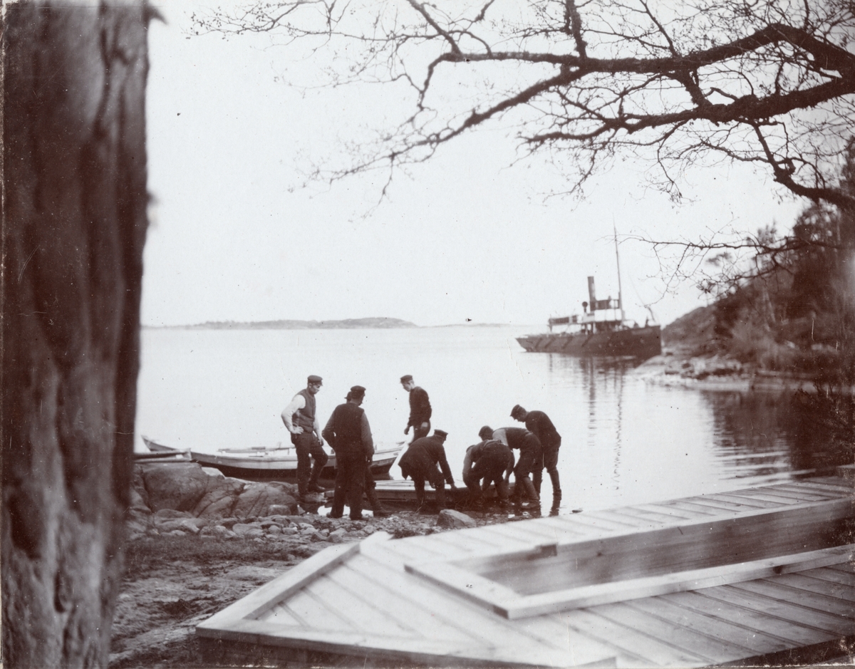 Vid Ornö. Ångbåten "Norden" i bakgrunden. Ur album: Kabelexpedition Gotland - Dalarö 1898.