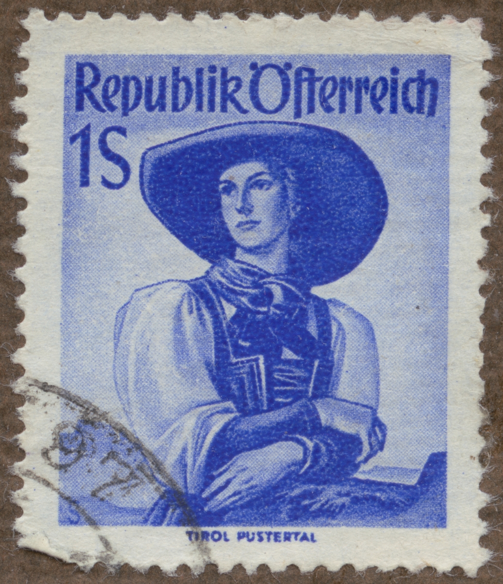 Frimärke från Österrike, 1948. Motiv av kvinnlig österrikisk dräkt, Tyrolen, Pustertal.