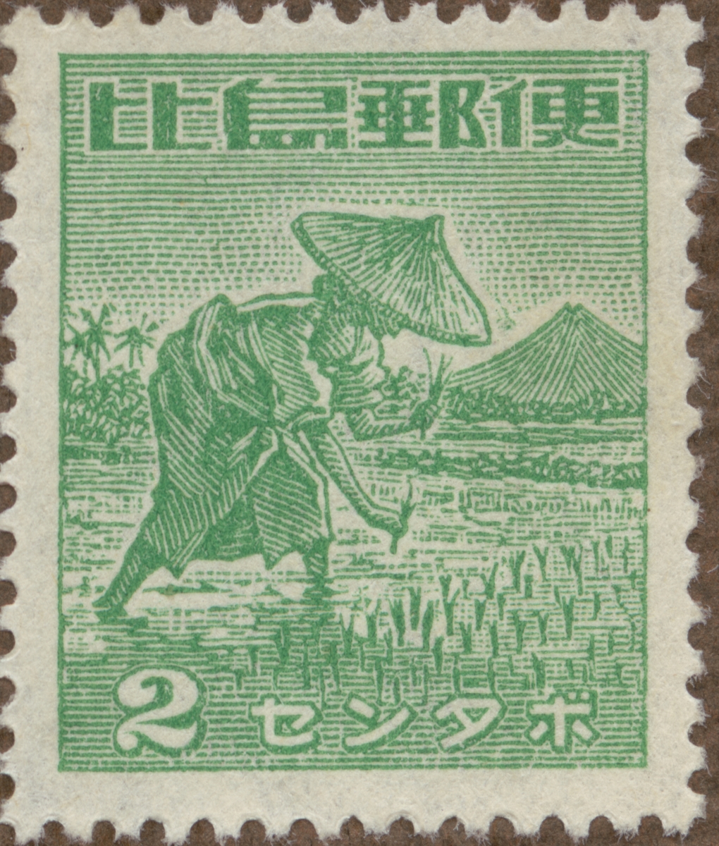 Frimärke från Filippinerna, 1943. Motiv av risplantage, plantering av ris. "Utgivet under japanska okkupationen: Världskrig II".