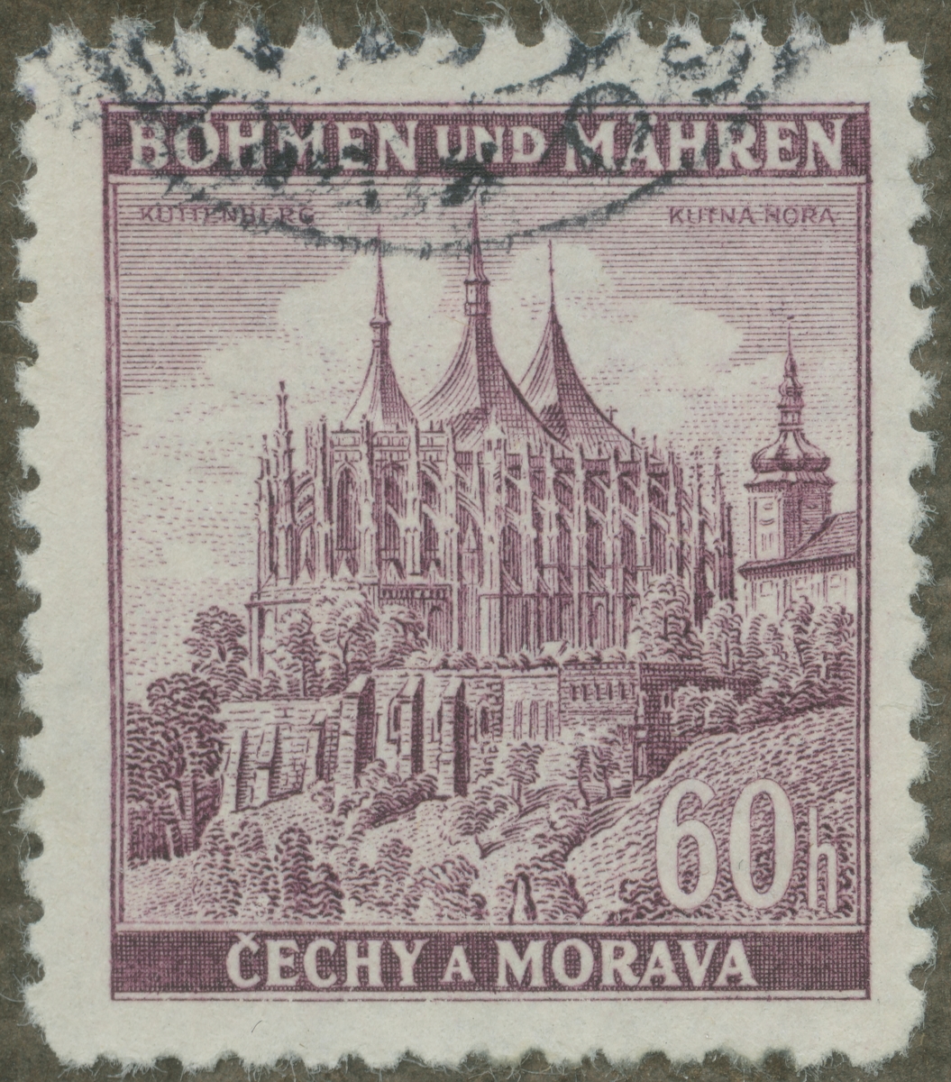 Frimärke från Böhmen-Mähren, 1939. Motiv av St. Barbarakyrkan i Kuttenberg.