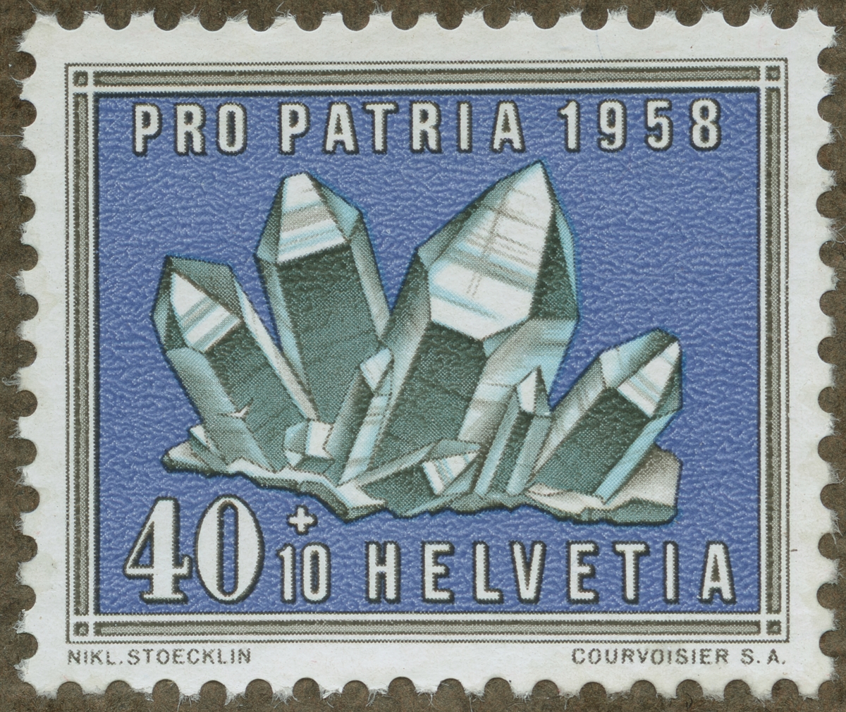 Frimärke ur Gösta Bodmans filatelistiska motivsamling, påbörjad 1950. Frimärke från Schweiz, 1958. Motiv av Bergskristaller "Pro Patria serien 1958"