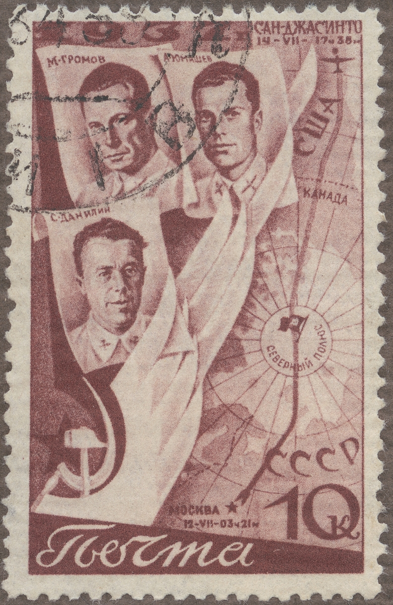 Frimärke från Ryssland, 1938. Motiv av Flygarne: Gromov, Youmachew och Daniline Den andra transpolarflygningen Moskwa- S:t Jacinte (Canada) 14-17 juli 1938