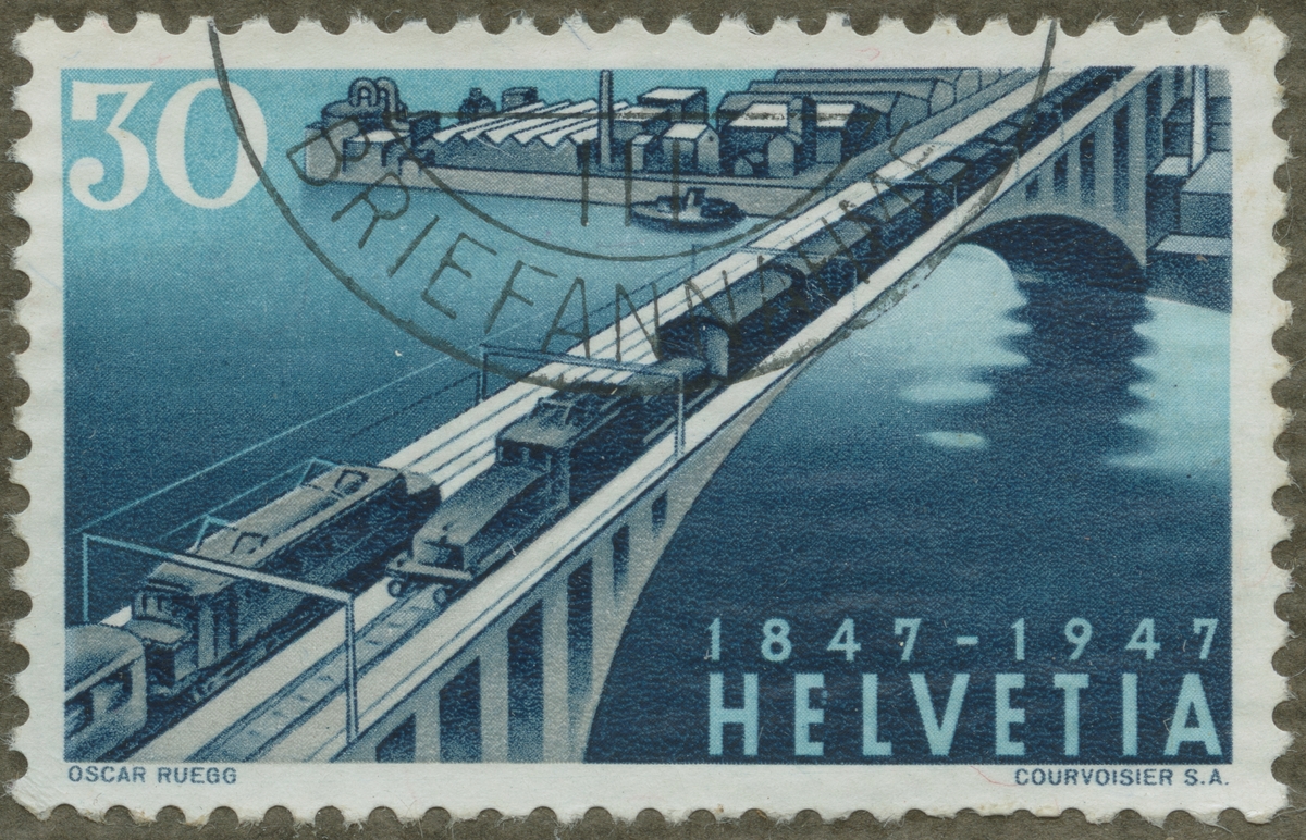 Frimärke från Schweiz, 1947. Motiv av Schweizisk järnvägsbro med dubbelspår Elektriska lokomotiv 1847-1947 100-årsminne av Schweiz´ järnvägar