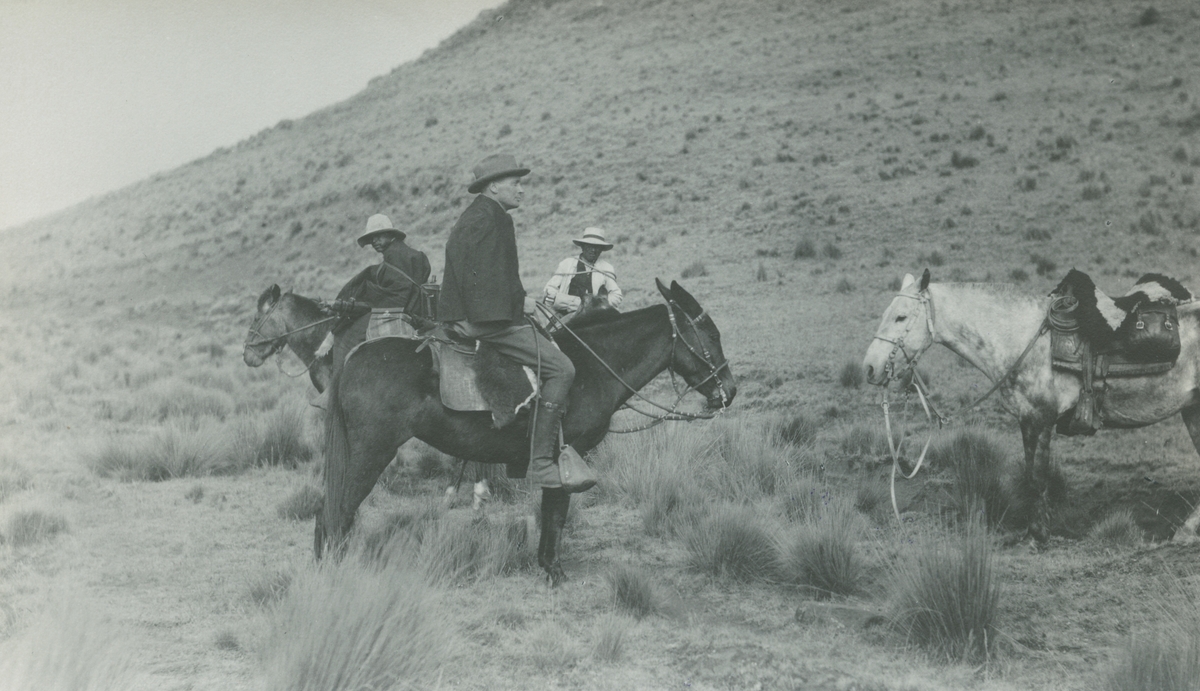 Fotografi från expedition till Peru 1920. Motiv av tre expeditionsdeltagare som rider på hästar i ett bergslandskap.