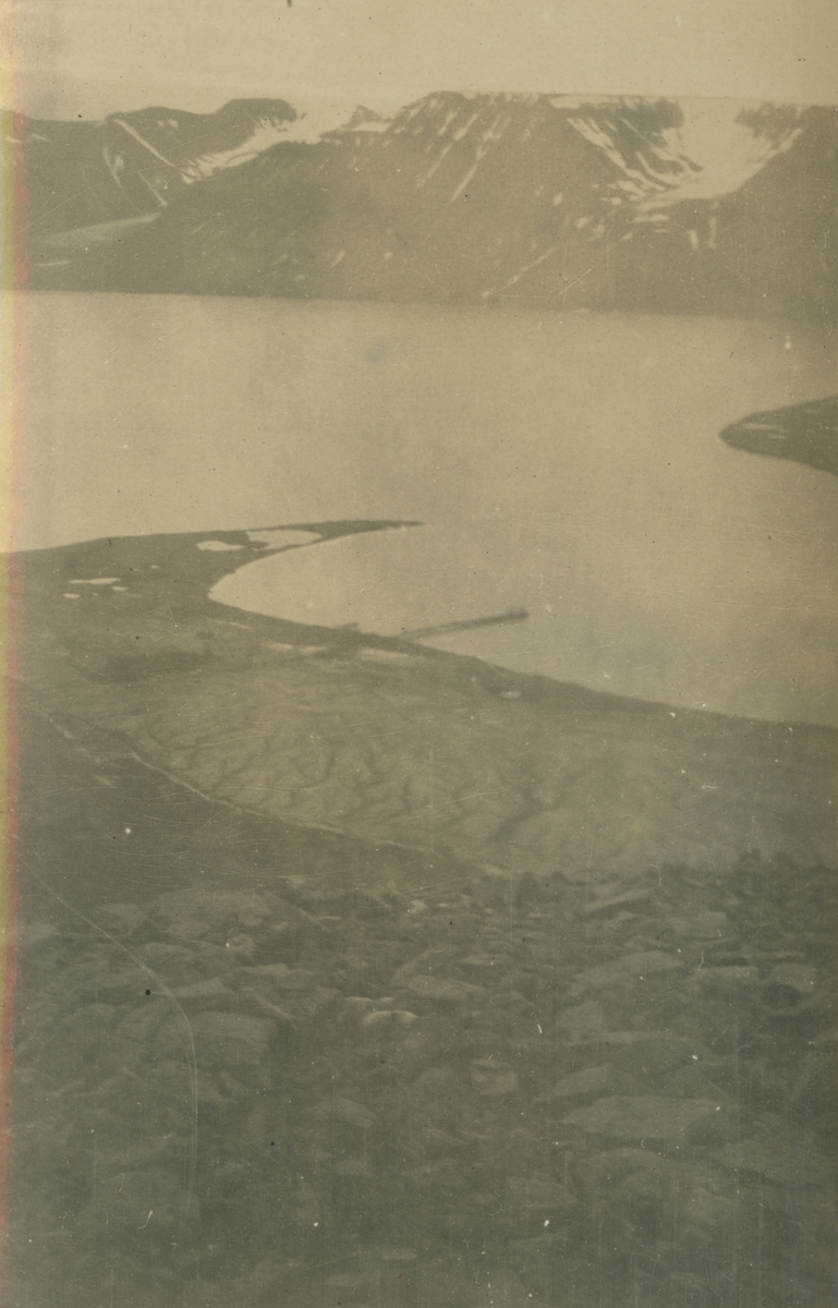 Fotografi från expedition till Spetsbergen. Vy över stenig strand, vatten och snötäckt berg.