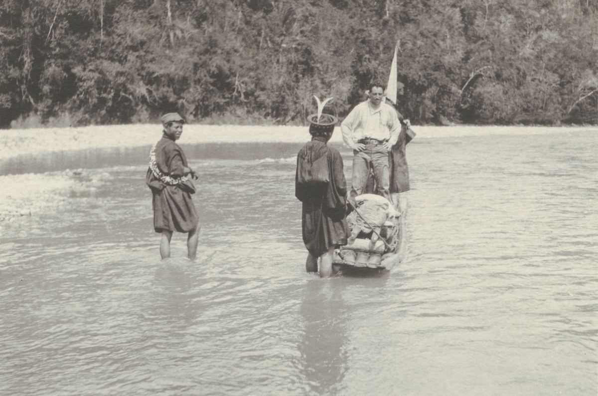 Fotografi från kuvert märkt med "Ernst Nordenskjöld". Motiv av expeditionsdeltagare på flotte i flod i djungel.