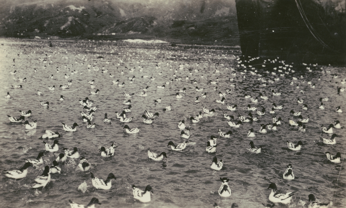 Bild från expedition i Antarktisområdet. Motiv av ett stort antal Kapduvor i vatten, 1930.