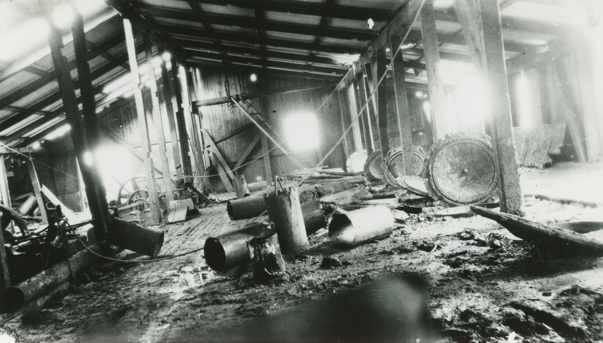 Bild från expedition i Antarktisområdet. Interiörbild från trähus fyllt med bråte.