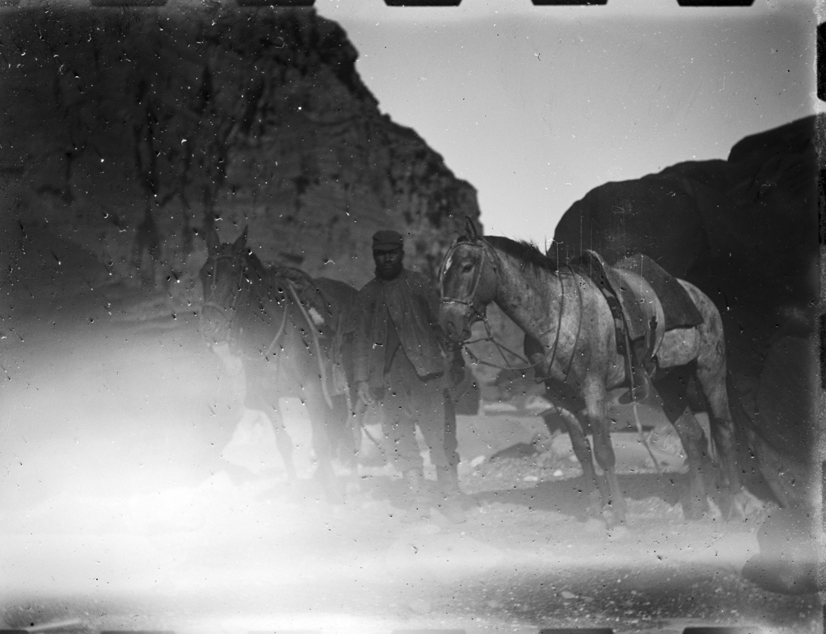 Fotografi från Eldslandet. Motiv av man med hästar.