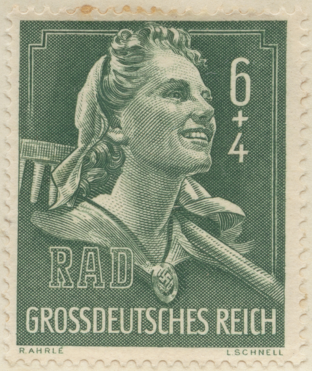 Frimärke från Tyskland, 1944. Motiv av tysk arbetarflicka med naziztiskt hakkorsemblem. "Till utställningen RAD (Reich Arbeits Dienst)".