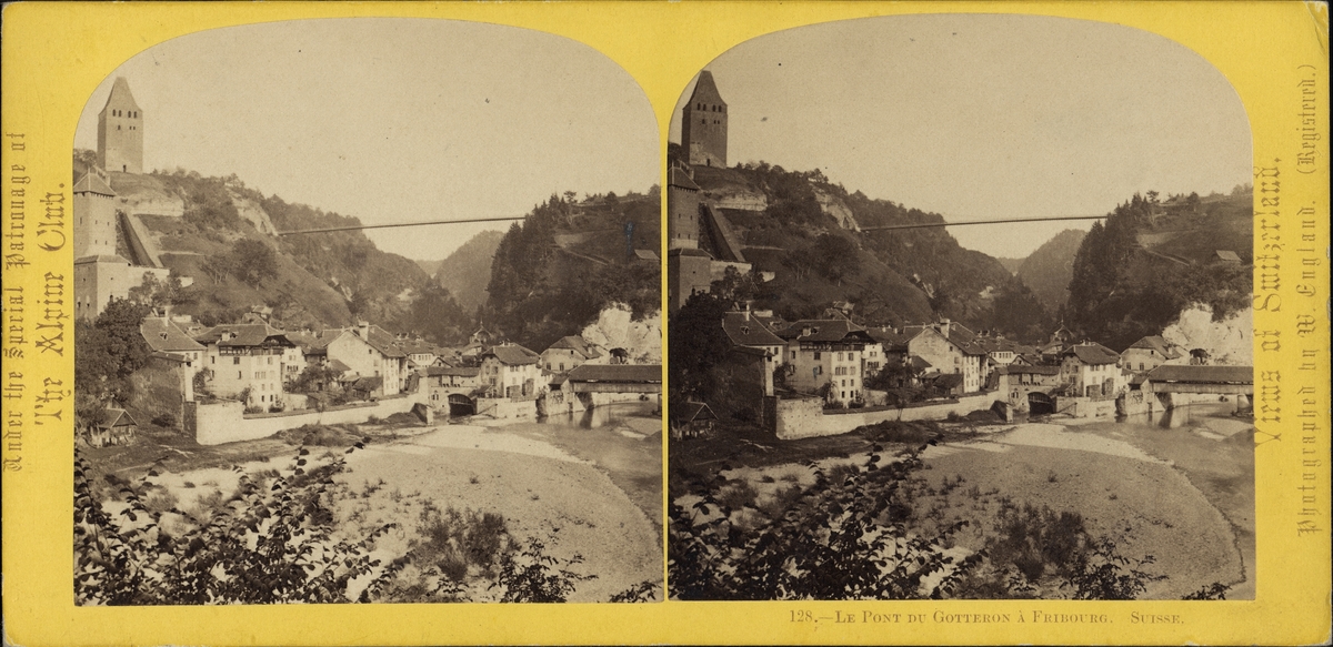 Stereobild, vy över Fribourg, Schweiz, bron i bakgrunden.