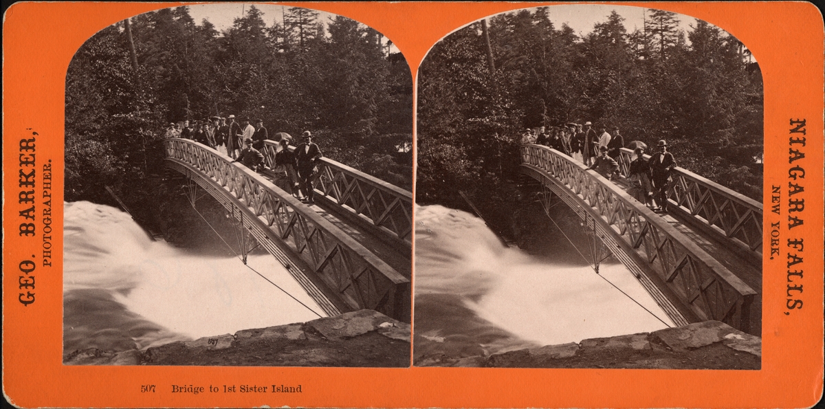 Stereobild av sällskap på bron till Sister Island, Niagara Falls.
