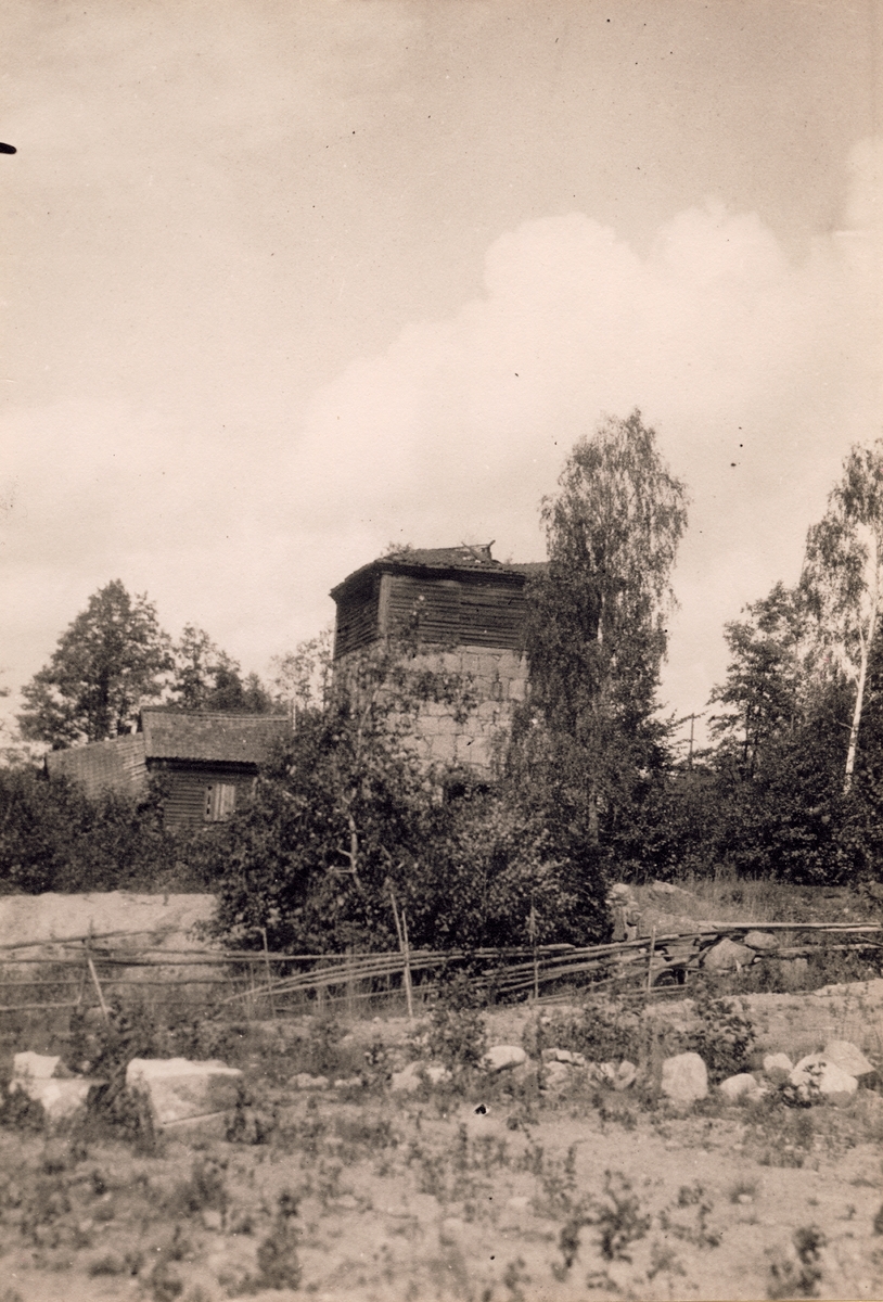 Hagelsrum masugn, Småland. Masugnsruinen. Träbyggnaden ovanpå stenfoten är brädväggar runt kransen.