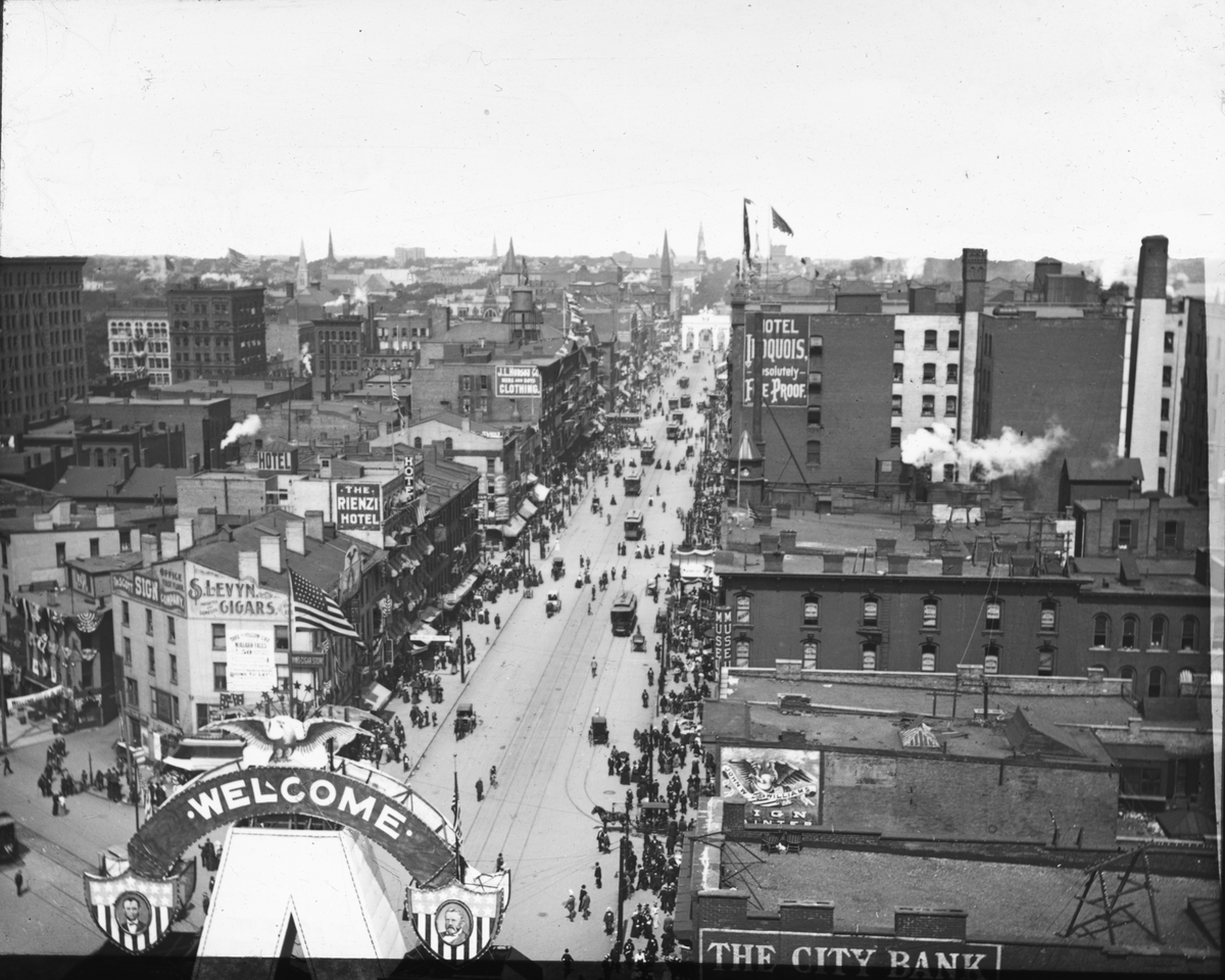 Skioptikonbild. Troligen Chicago, Rienzi Hotel (mitten vänster) ett klassiskt gangstertillhåll i Chicago.