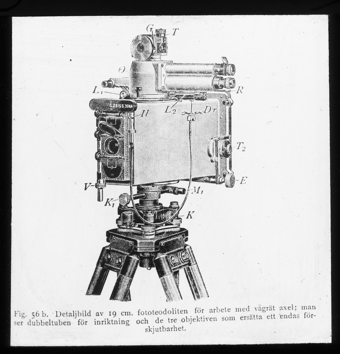 Detaljbild av 19 cm. fototeodoliten för arbete med vågrät axel# man ser dubbeltuben för inriktning och de tre objektiven som ersätta ett endas förskjutbarhet.