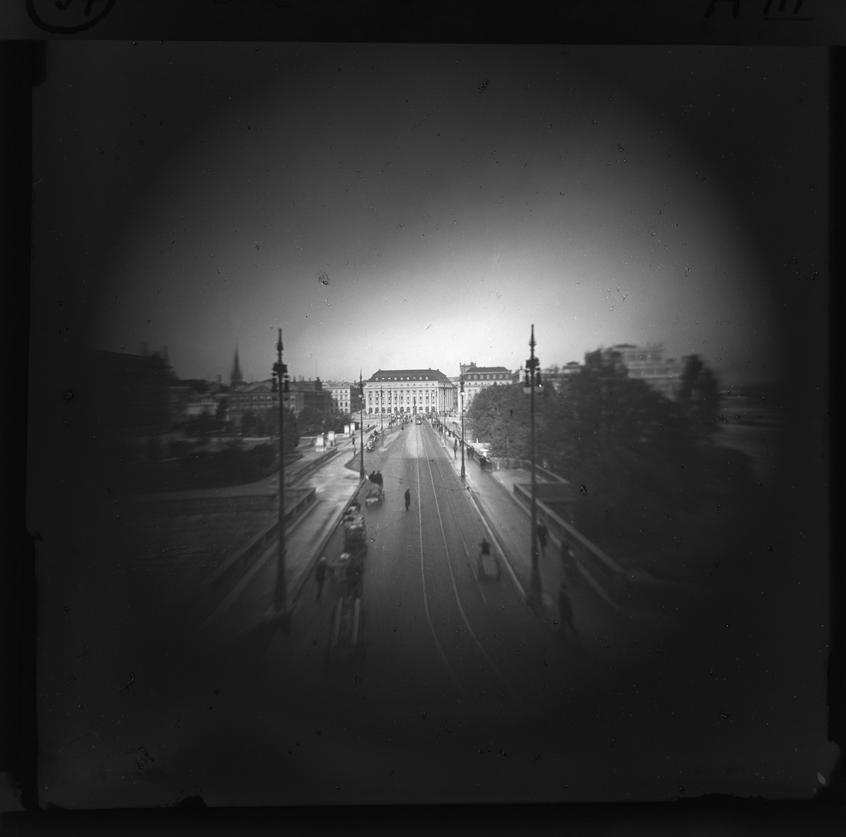Vinjettringens utseende vid använding av stor bländare. Vy över Norrbro Stockholm, sett från Kungliga slottet.