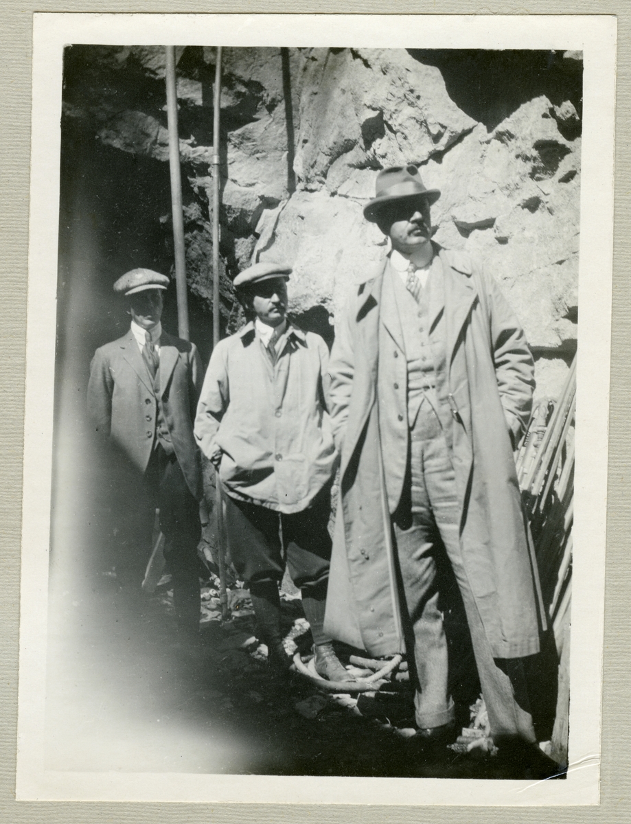 Disponent Th. Wigeliu, direktör O. Falkman och ingenjör Åkerström i mynningen till Knuts stall i Bastnäs. Stollen jämte därtill hörande schakt är uppkallade efter fotografen Kurt Mårtsell.