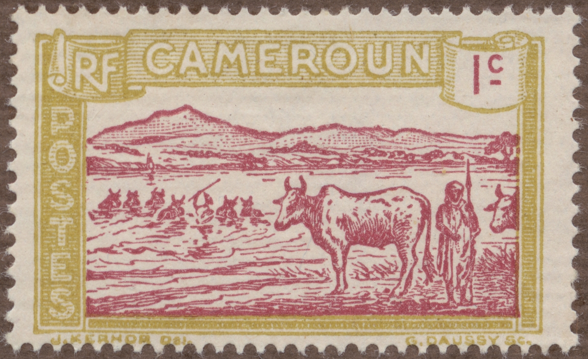 Frimärke från Kamerun, 1925. Motiv av Boskapshjord av Zeburas simma över Sanagafloden.