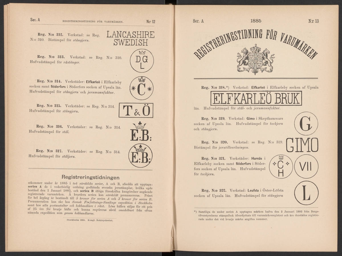 Registreringstidning för varumärken 1885. Serie A, Svenska järnstämplar.