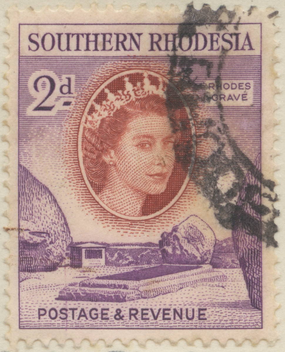 Frimärke från Syd Rhodesia, 1953. Motiv av Gravmonument över Cecil Rhodes: 1853-1902: Sydafrik. finansman, grundare av britt. Sydafrikaväldet. (ovan) Drottning Elizabeth II-