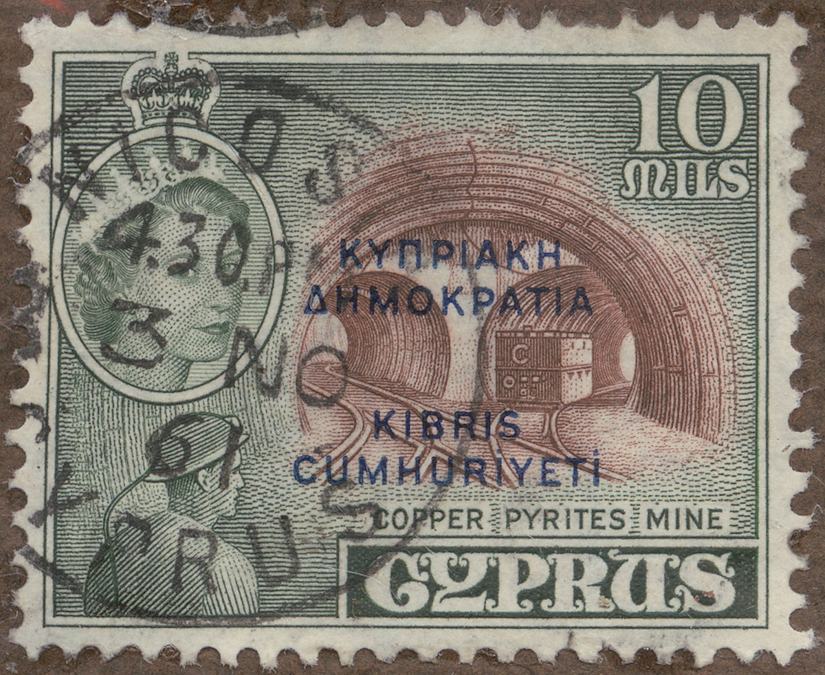 Frimärke från Cypern, 1960. Motiv av Koppar Pyrit Gruva på Cypern (Cypern, f.d. britt. kronkoloni, blev republik i 1960) överstämplad 1953 märke med grekisk text: Republiken Cypern.