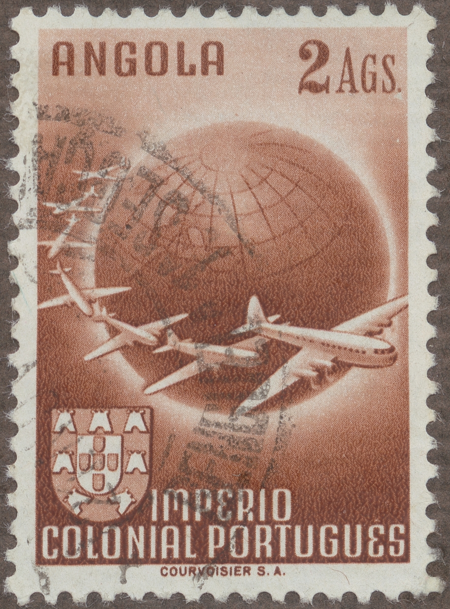 Frimärke från Angola, 1949. Motiv av Jordglob omgivet av fyrmotoriga monoplan