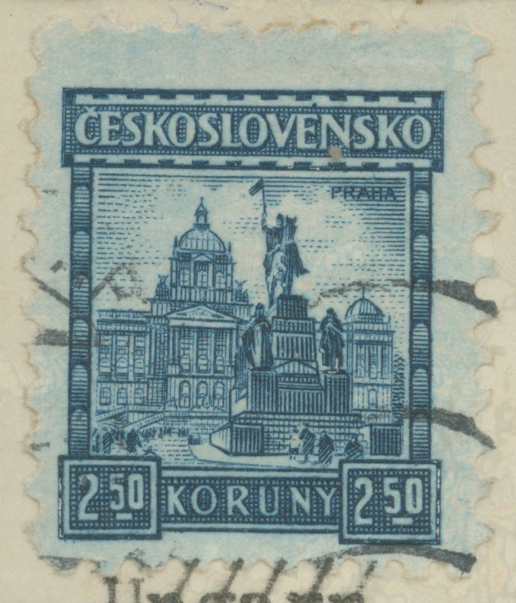 Frimärke från Tjeckoslovakien, 1936. Motiv av museum med St. Wenzels Staty i Prag.