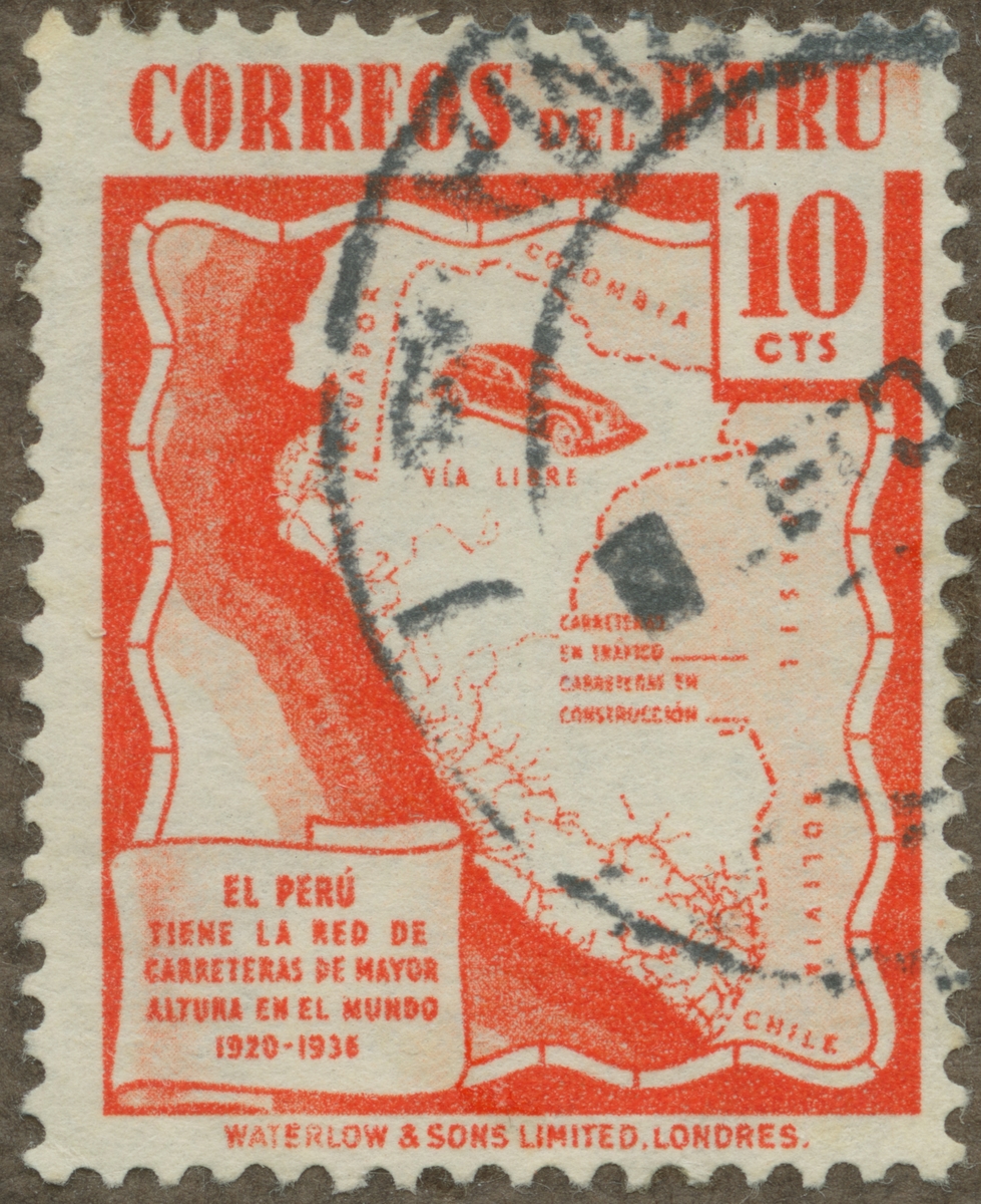 Frimärke från Peru, 1938. Motiv av Karta över Peru med världens högsta resväg.