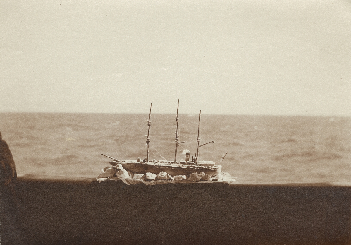 Fotografi från första svenska Antarktisexpeditionen 1901-1904. Motiv av båtmodell som är placerad på en reling vid havet. Modellen liknar fartyget Antarctic.