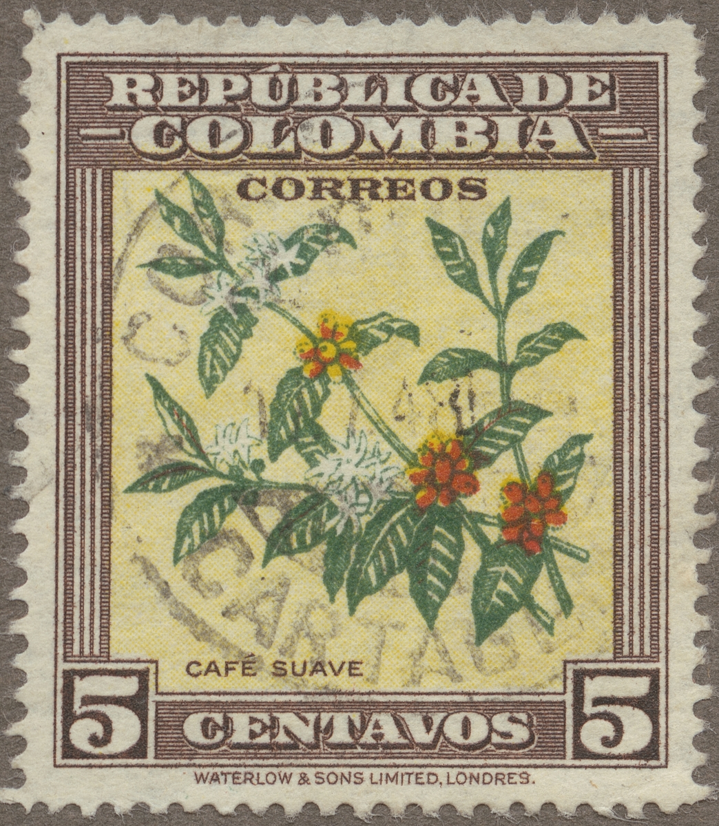 Frimärke från Colombia, 1947. Motiv av kaffebuskens gren med blommor och frukt.