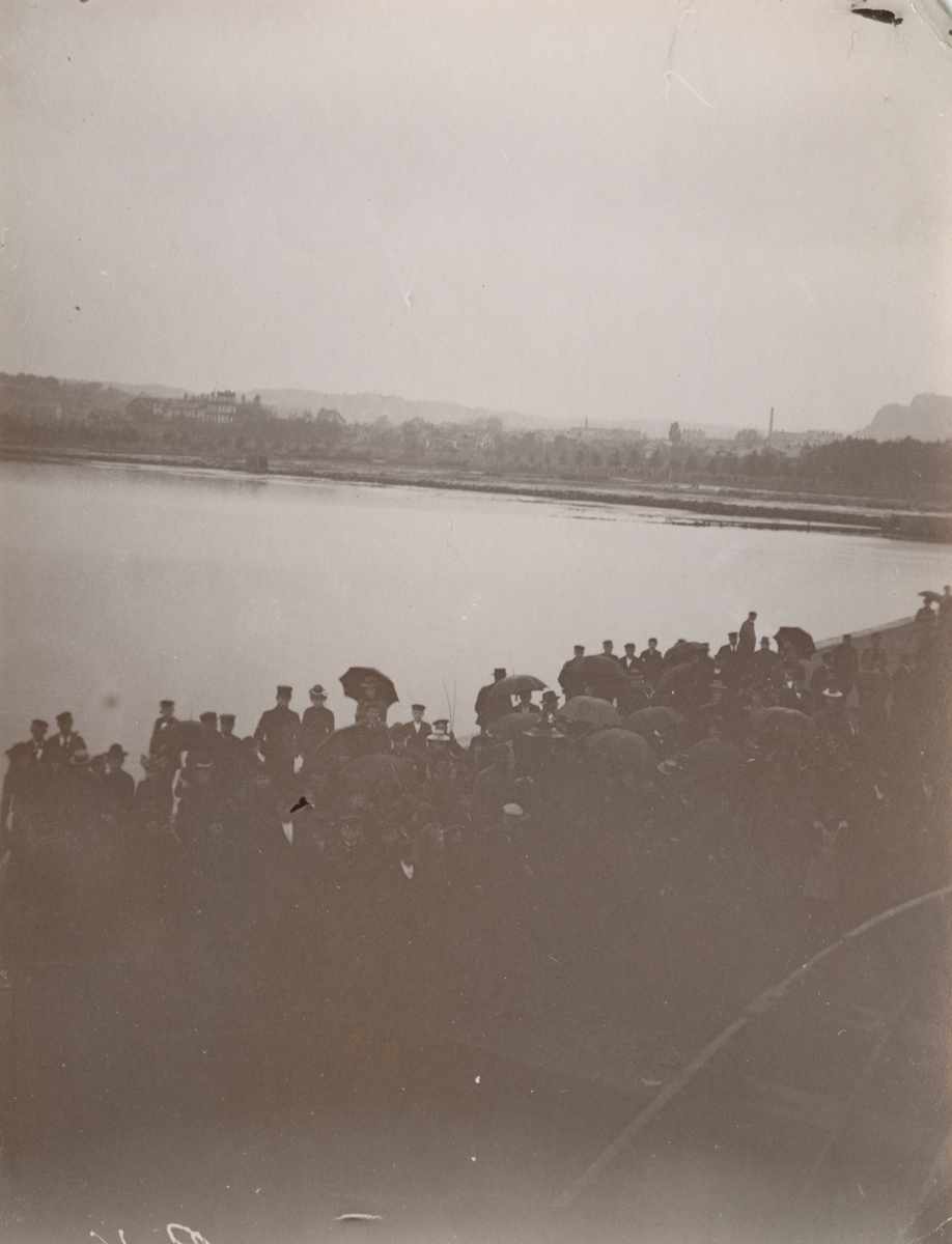 Fotografi från expedition till Peru 1920. Motiv av stor samling människor på kaj vid havet.