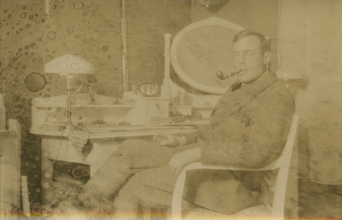 Fotografi från expedition till Spetsbergen. Motiv av man som sitter inomhus och röker pipa.