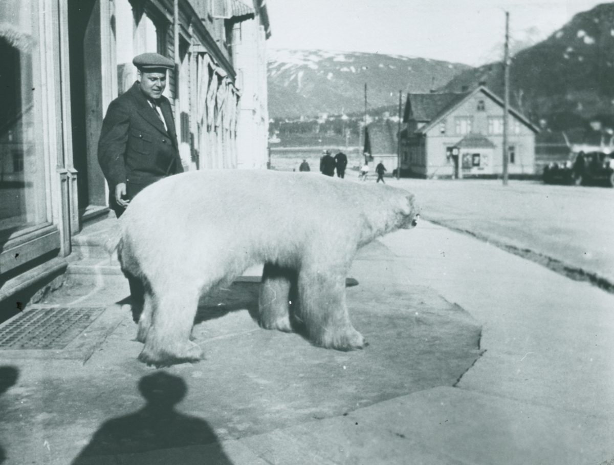 Glasnegativ med motiv av man vid uppstoppad isbjörn.