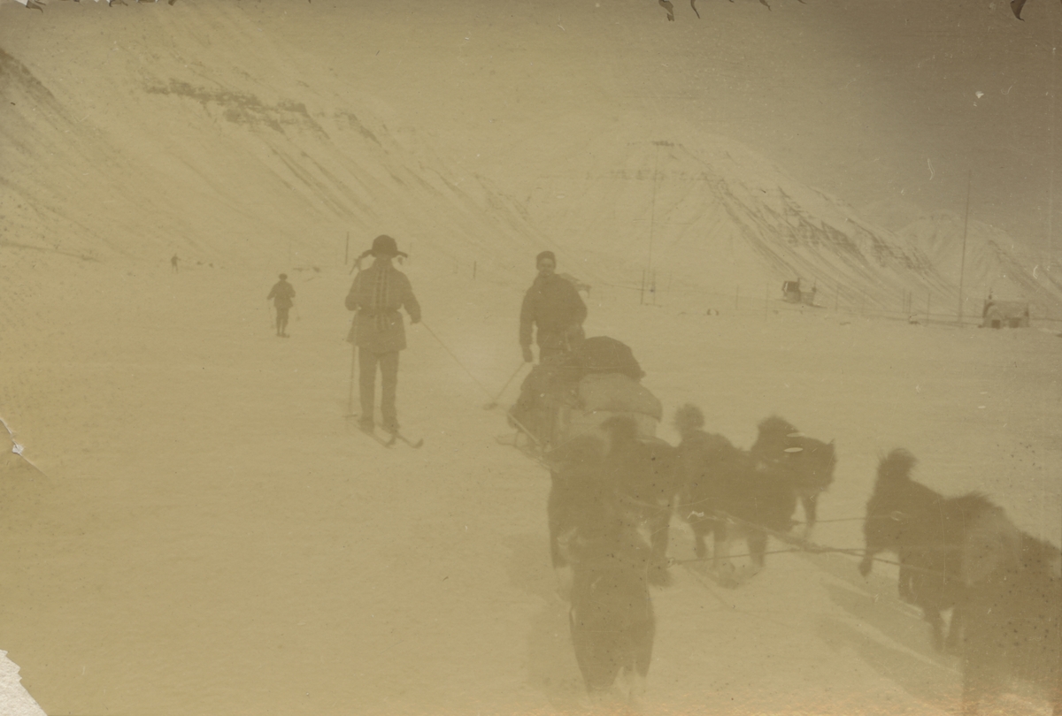 Fotografi från expedition till Spetsbergen. Motiv av expeditionsdeltagare med hundspann i ett snötäckt bergslandskap.
