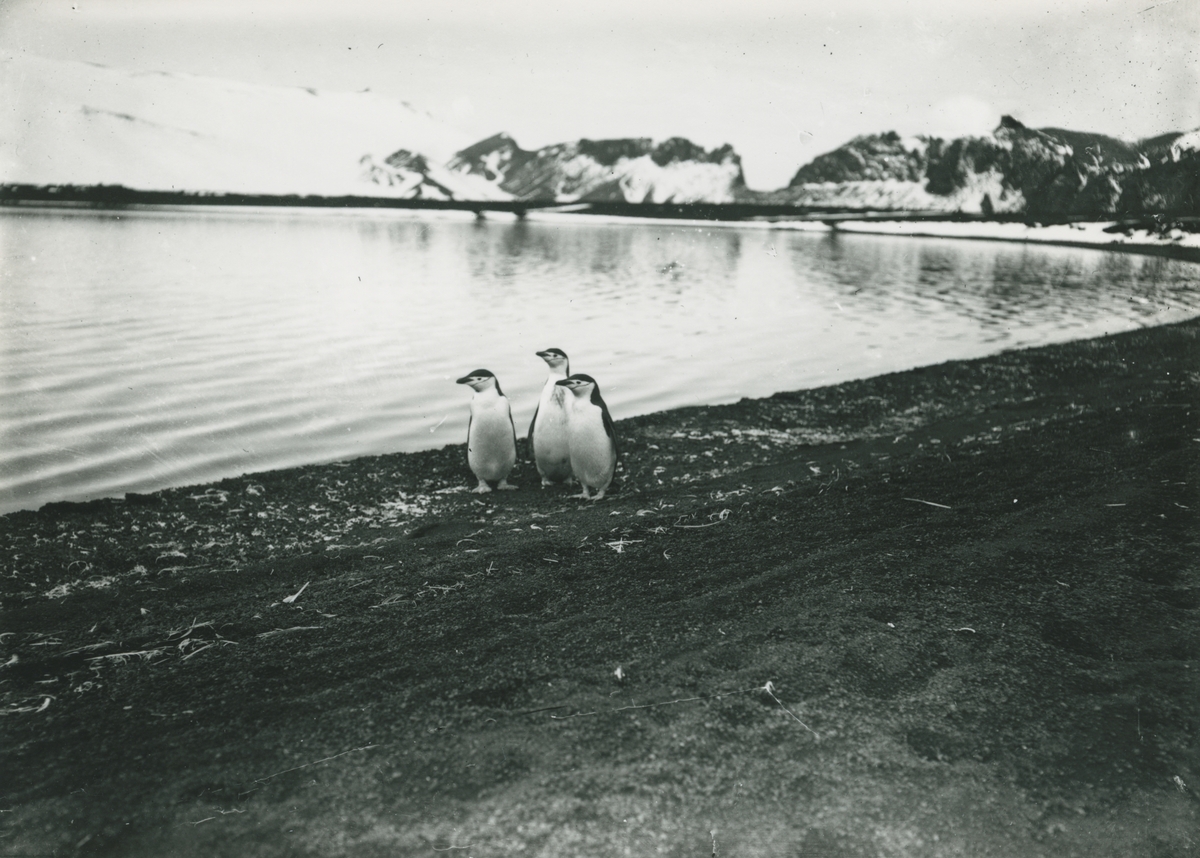 Bild från expedition i Antarktisområdet. Motiv av tre pingviner på strand.