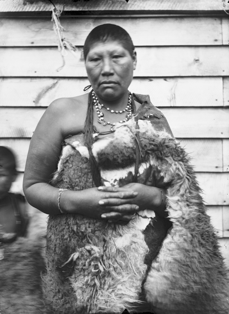 Fotografi från Eldslandet. Motiv av kvinna iklädd djurhud.