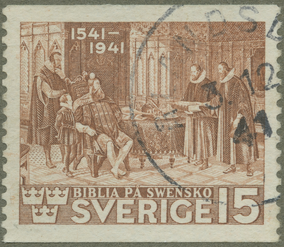 Frimärke från Sverige, 1941. Motiv av Den första i Sverige på svenska tryckta bibeln överlämnas till kung Gustaf Wasa 1541. 400-årsminne av den första svenska tryckta bibeln.