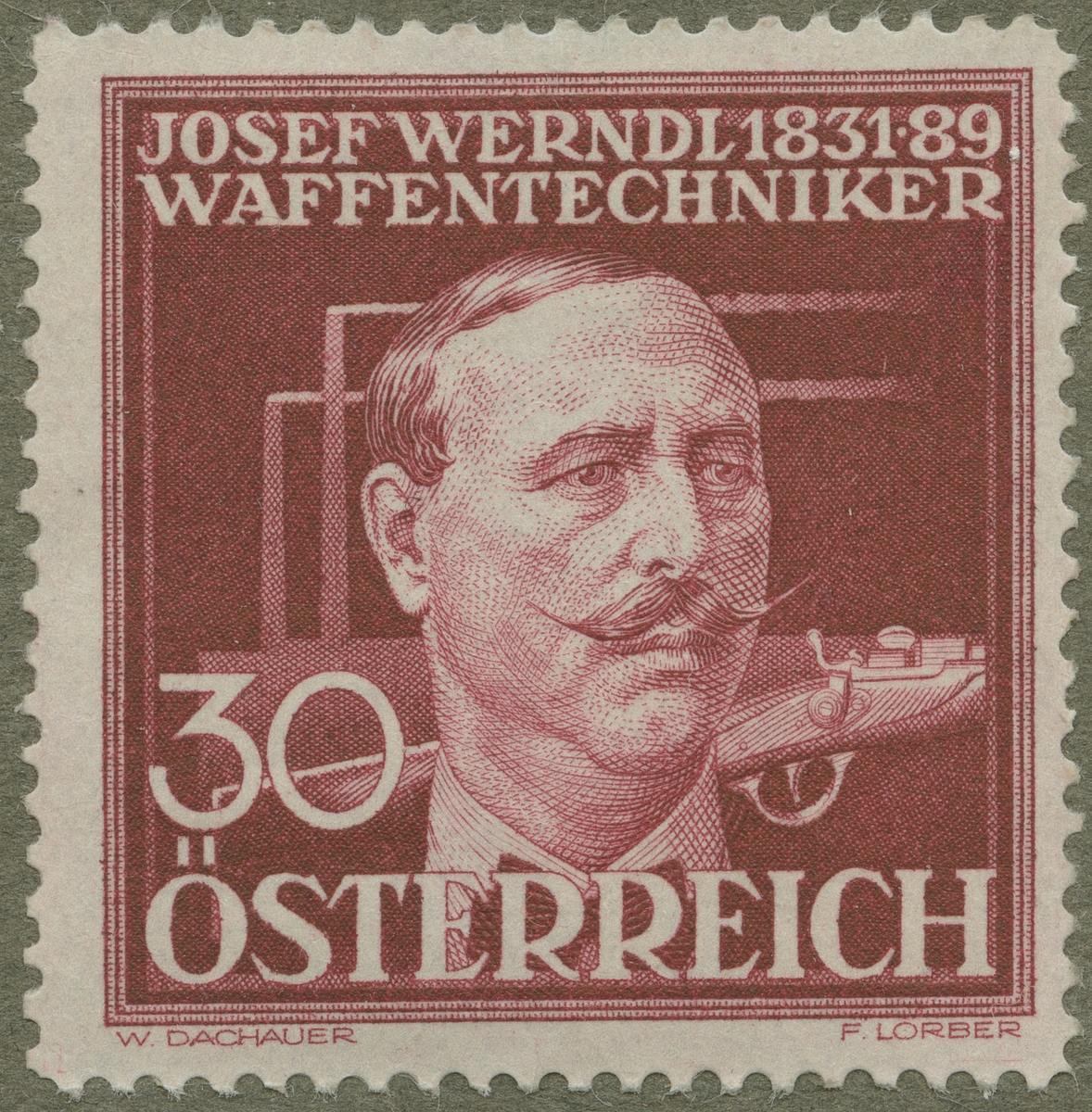 Frimärke från Österrike, 1936. Motiv av Josef Werndl 1831-1889. Österrikisk vapentekniker.