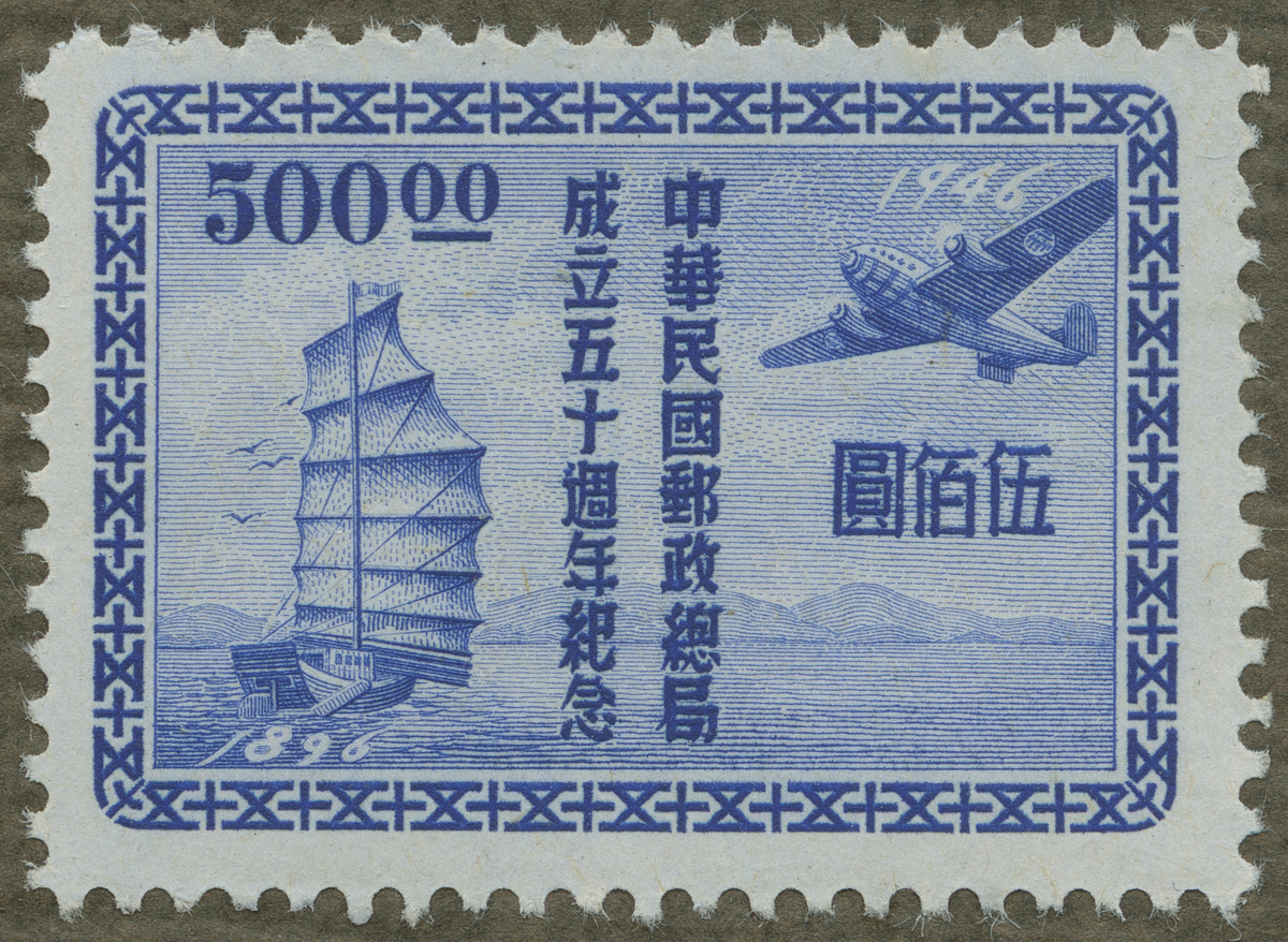 Frimärke från Republiken- Kina, 1946. Motiv av Stor kinesisk djonk, seglare 1896 Tvåmotorigt monoplan 1946 Kinesiska postväsendets jubileum (50-år) 1896-1946.