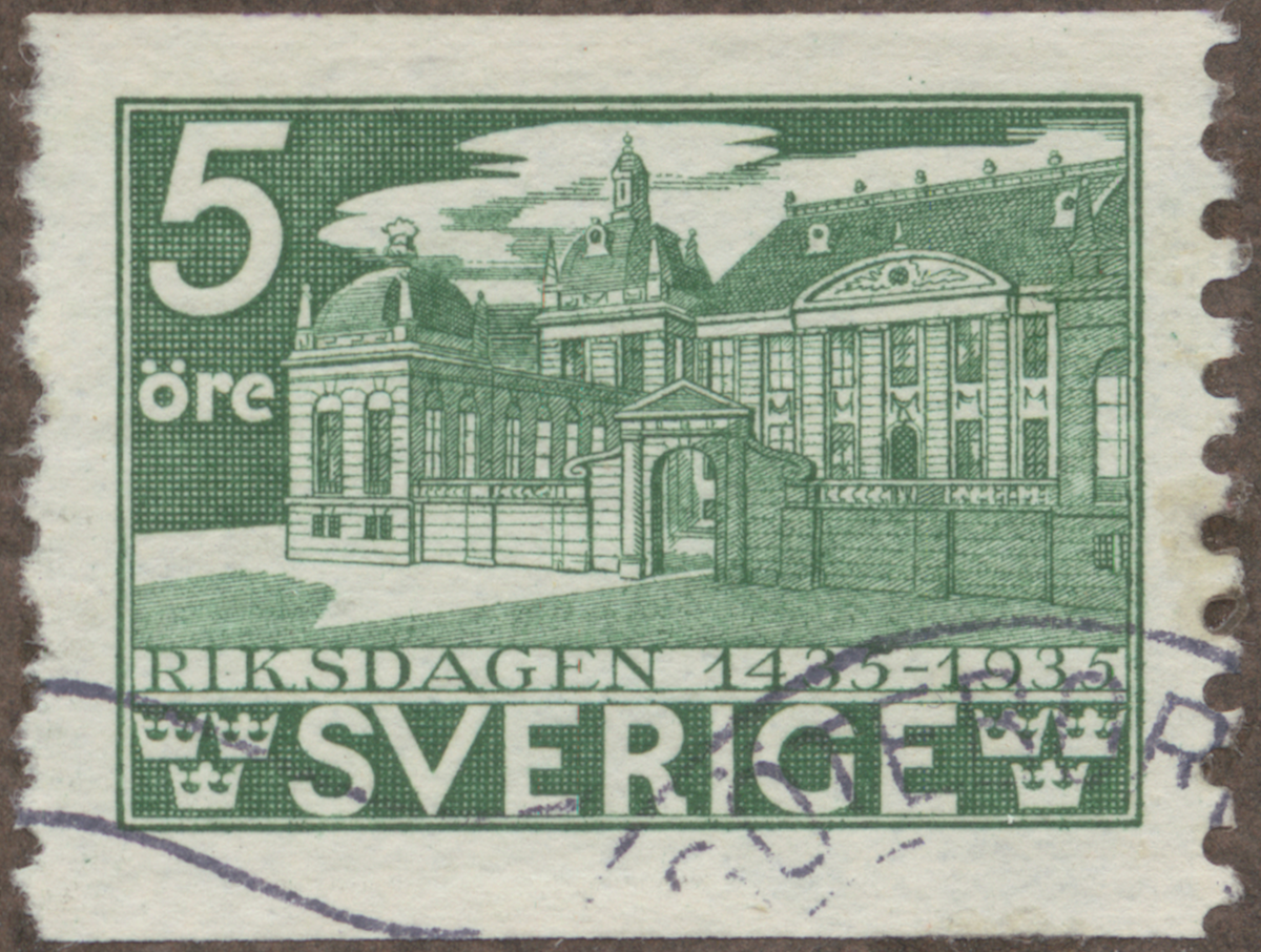 Frimärke från Sverige, 1935. Motiv av Det gamla Justitiedepartementet i Stockholm "Den svenska Riksdagen 500 år: 1435-1935"