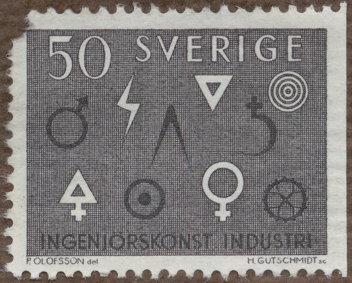 Frimärke från Sverige, 1963. Motiv av Skära med kors uppåt och andra 3000-år gamla symboler för svensk industri och ingeniörskonst. Skära med kors uppåt är det kemiska tecken för bly som alkemister och kemister använde.