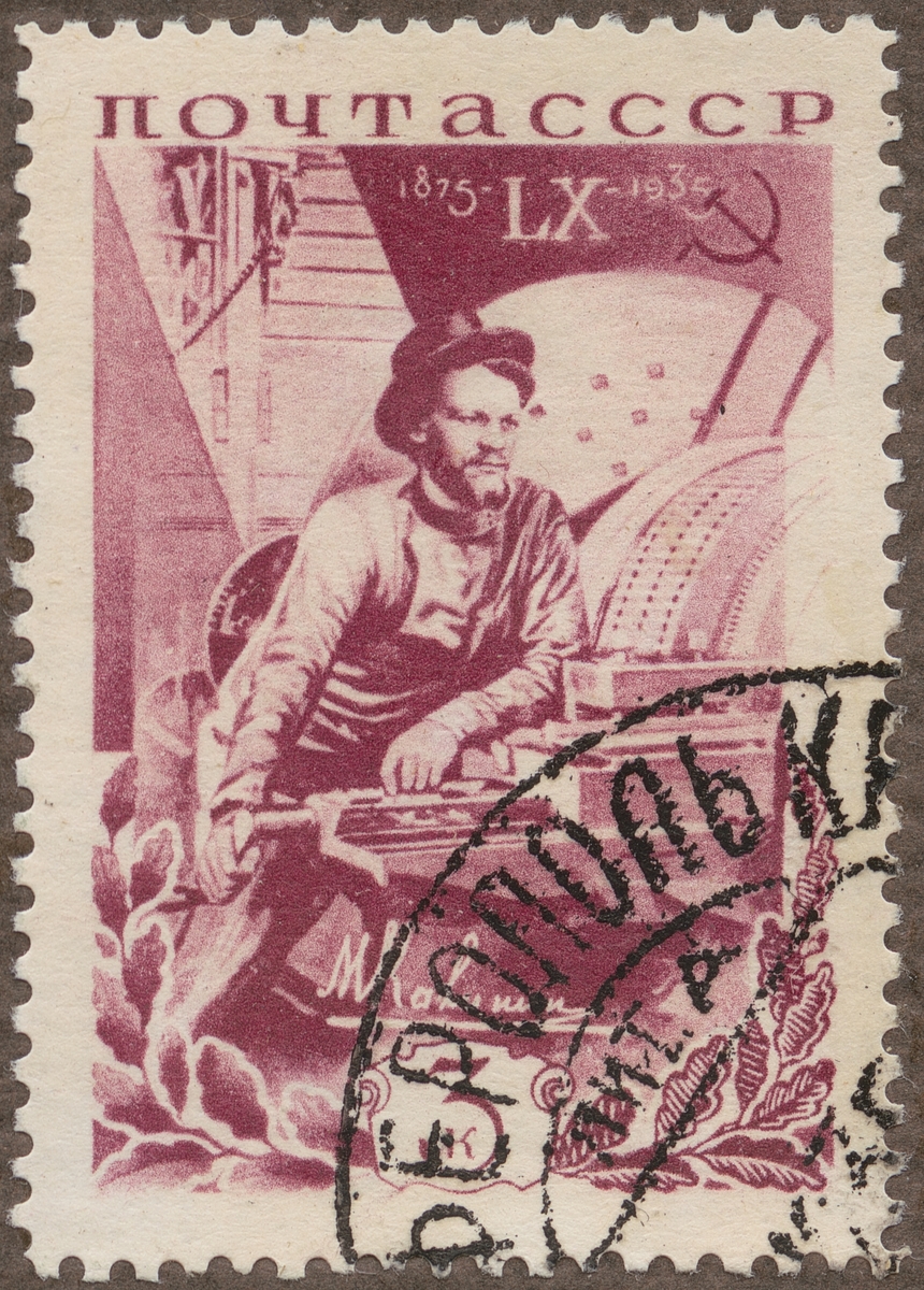 Frimärke från Ryssland, 1935. Motiv av Kalinin som mekanisk verkstadsarbetare i Reval Michail Ivanovitj Kalinin. Rysk politiker. 1875-1946. -Minne av Kalinins 60-årsdag-1935.