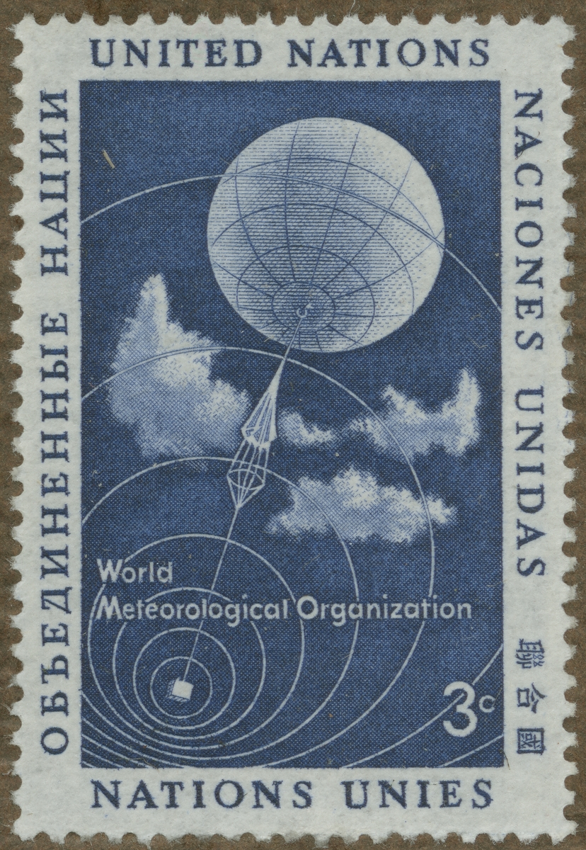 Frimärke från F. N. 1957. Motiv av jordglob. "World Meteorological Organisation".