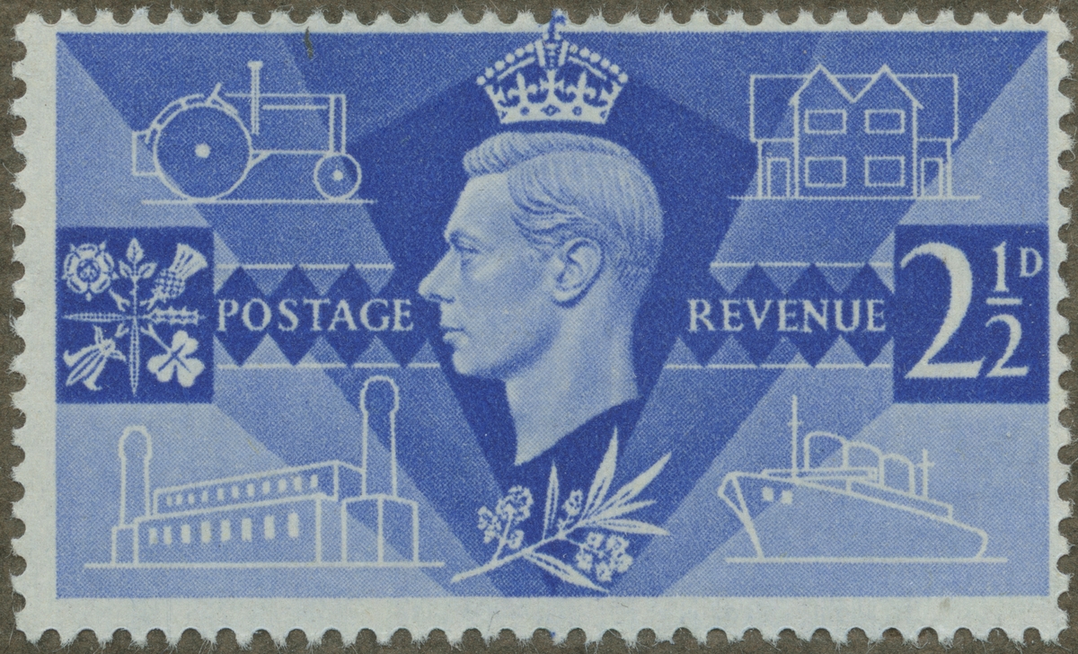 Frimärke ur Gösta Bodmans filatelistiska motivsamling, påbörjad 1950. Frimärke från England, 1946. Motiv av Bostadshus, Traktor, Fabrik, Ångare. "Symboler för återuppbyggnad efter kriget."