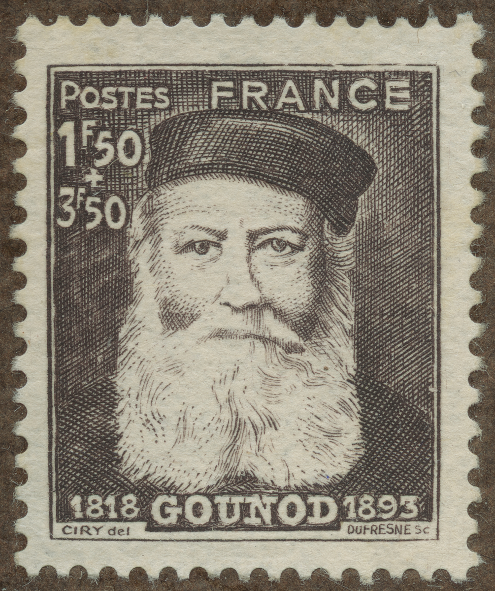 Frimärke från Frankrike, 1944. Motiv av Charles François Gounod: 1818-1893. Kompositör: "Faust". 50-årsminne av hans död: 1893-1944.